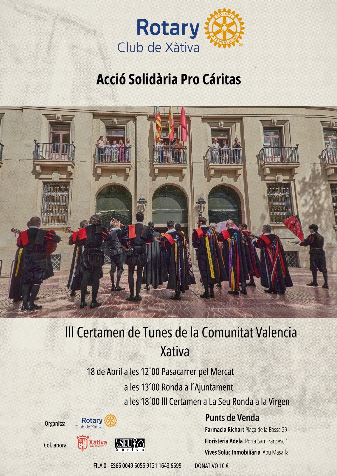 El Rotary Club de Xàtiva organiza el III Certamen de Tunas de la Comunitat Valencia, un evento solidario lleno de música, tradición y cultura, cuyo objetivo es recaudar fondos en beneficio de Cáritas.
